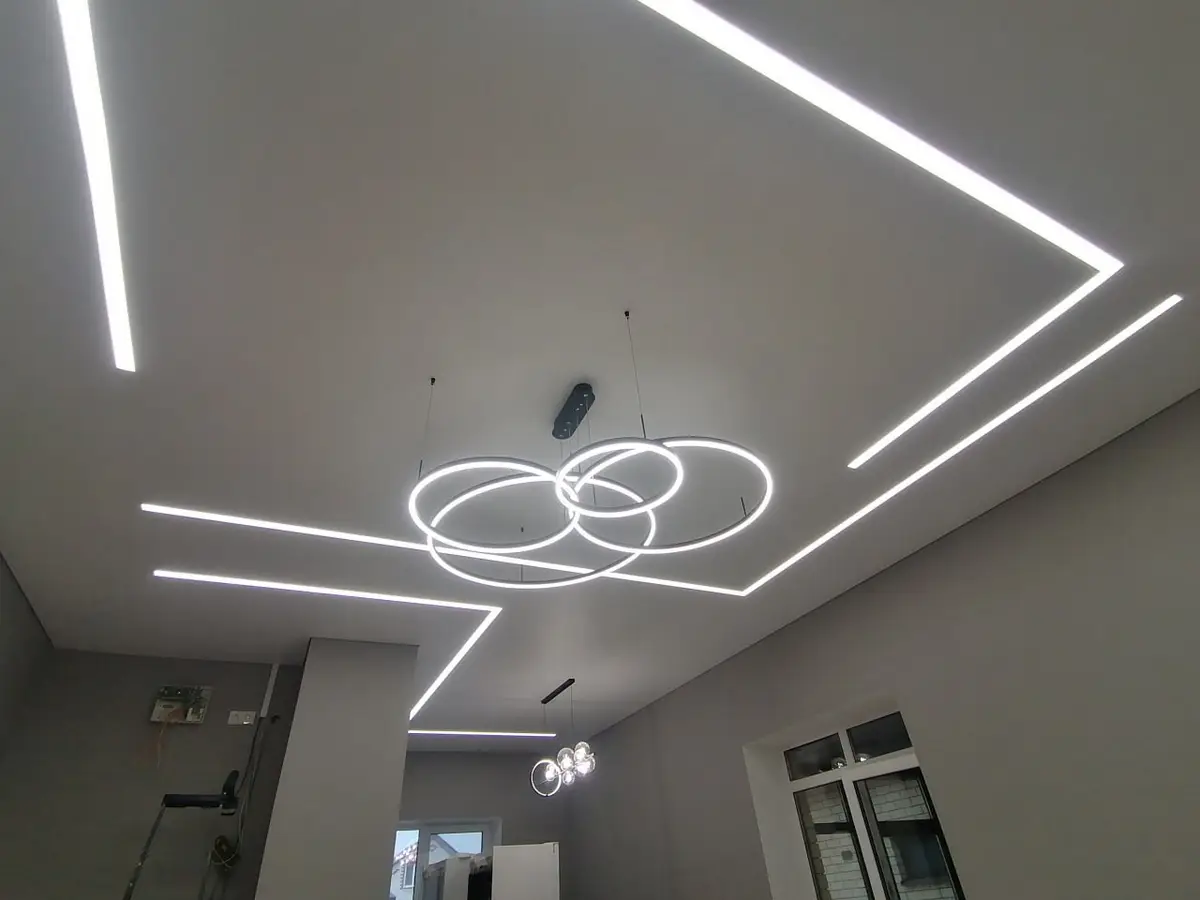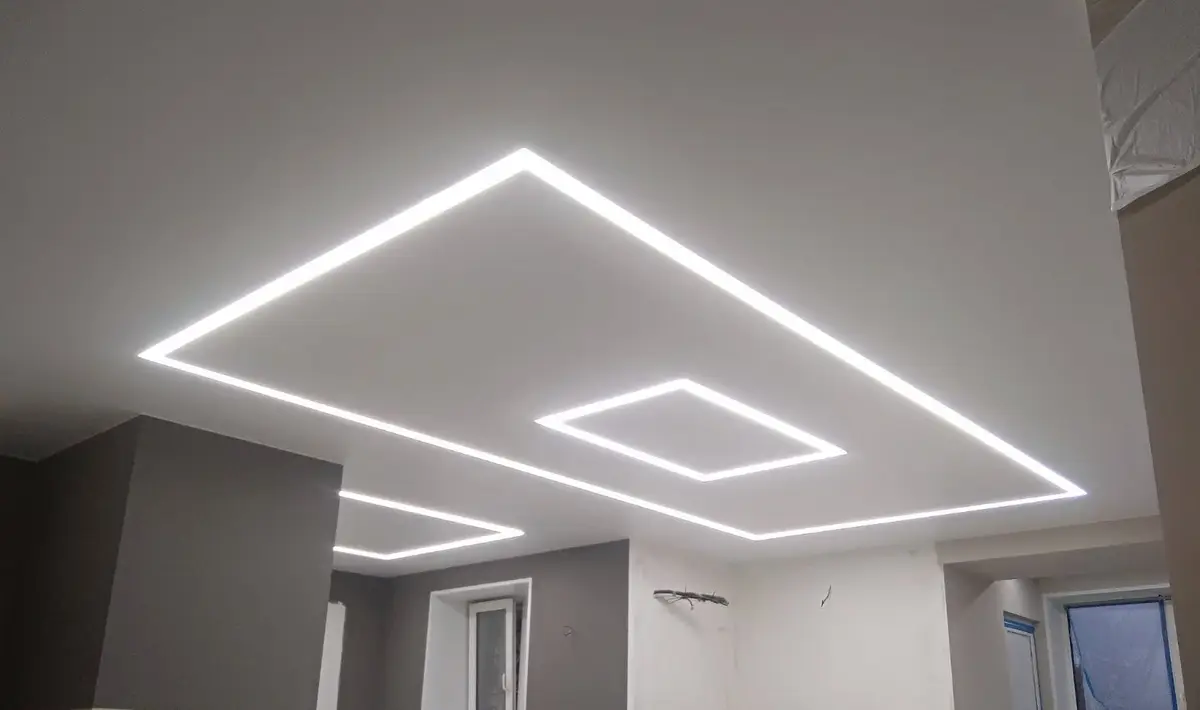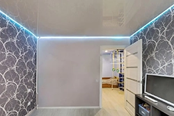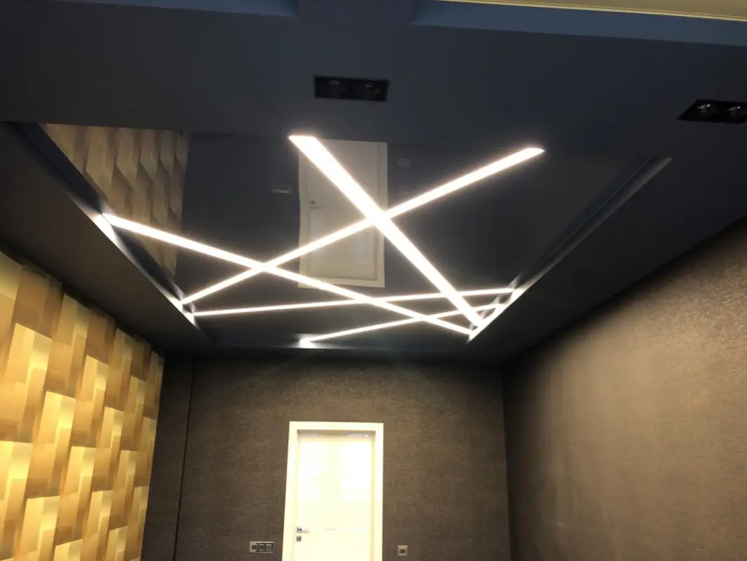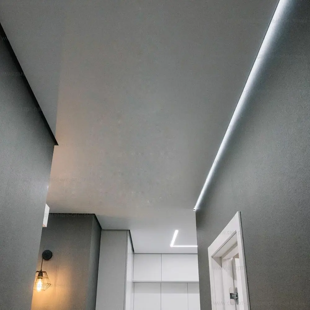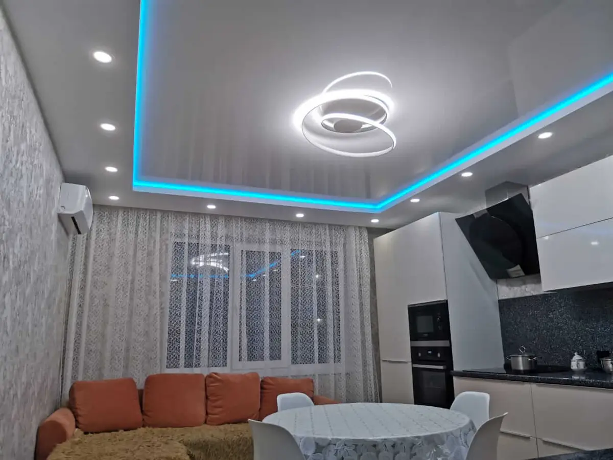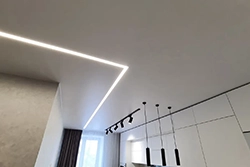 Это потолки с использованием светодиодной ленты по периметру. Для этого используется специальный профиль, который отходит от стены, в это пространство устанавливается светодиодная лента, создается эффект парения, за счет того, что потолок не примыкает к стенам и из-за потолка исходит легкое свечение. Уютная атмосфера помещения в вечернее время, создает подсветка по периметру, она может быть классической белой, а также цветной однотонной и переливающейся разными цветами. Этот эффект можно применить абсолютно для любого помещения, гостиной, детской, спальни, коридора, а также и ванной