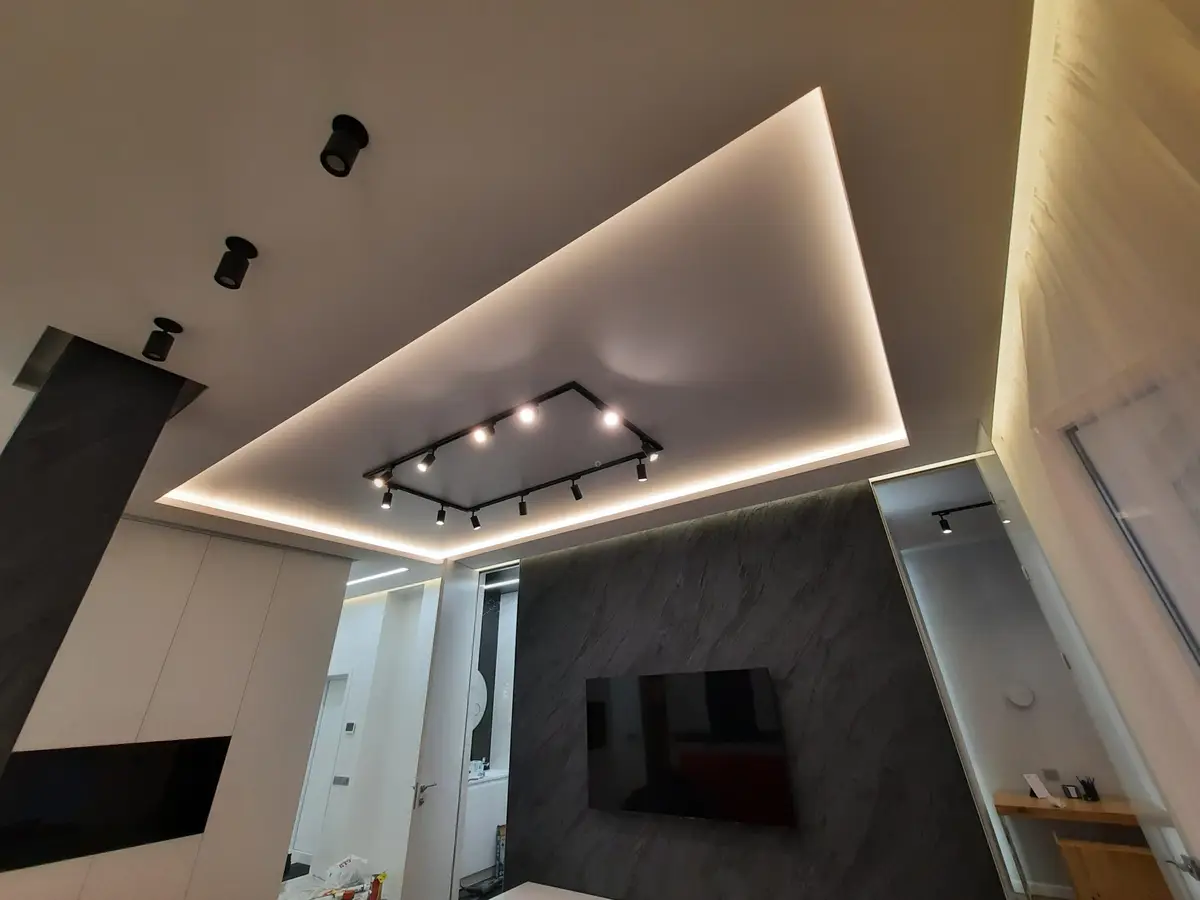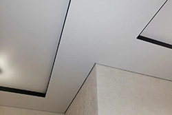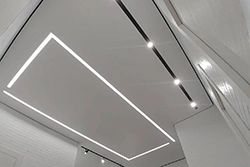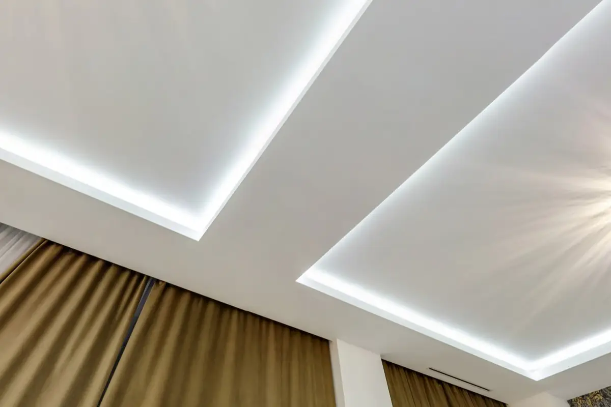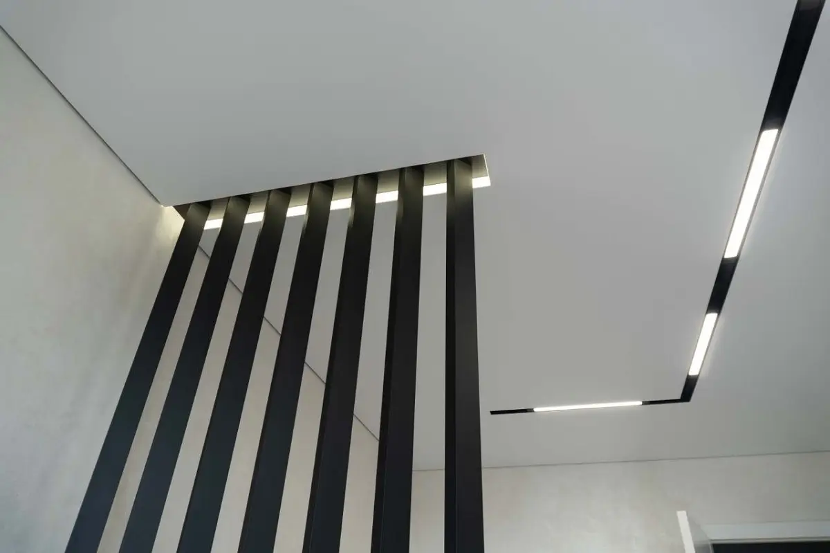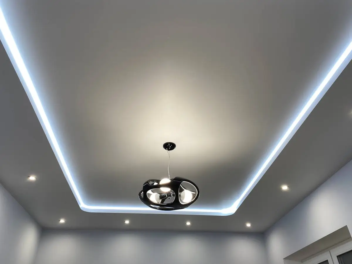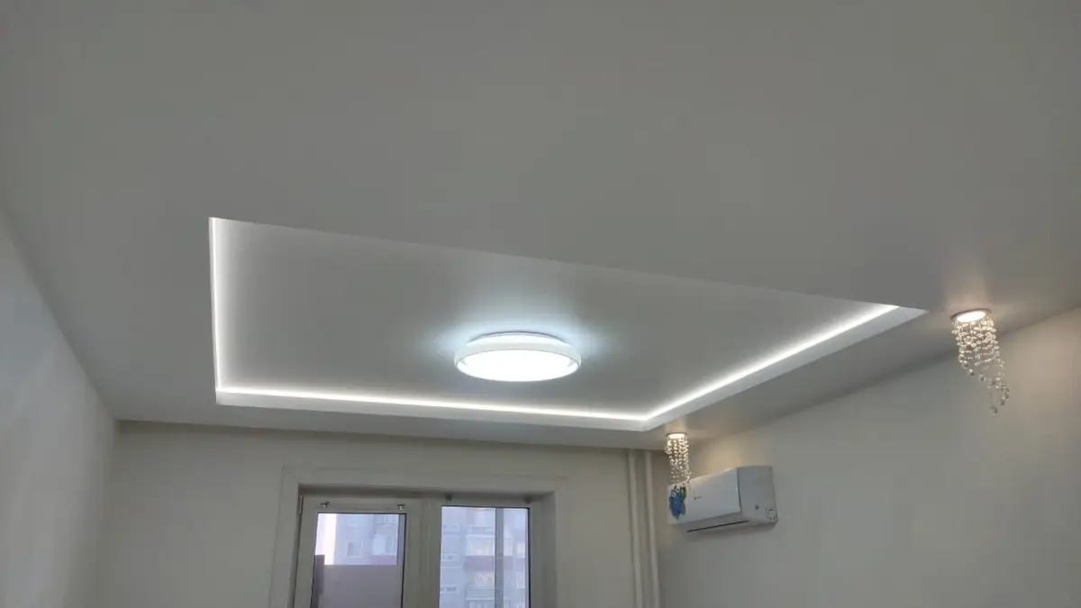 Это потолки с использованием светодиодной ленты по периметру. Для этого используется специальный профиль, который отходит от стены, в это пространство устанавливается светодиодная лента, создается эффект парения, за счет того, что потолок не примыкает к стенам и из-за потолка исходит легкое свечение. Уютная атмосфера помещения в вечернее время, создает подсветка по периметру, она может быть классической белой, а также цветной однотонной и переливающейся разными цветами. Этот эффект можно применить абсолютно для любого помещения, гостиной, детской, спальни, коридора, а также и ванной